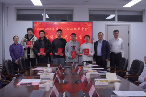 王全德副主任宣读了“人和环保奖学金”表彰决定。随后,江苏人和环保设备有限公司管理中心总监杨飞能先生为获奖学生代表颁发荣誉证书并合影留念。碳中和科学与工程专业2023级硕士研究生魏英超作为获奖学生代表进行发言。